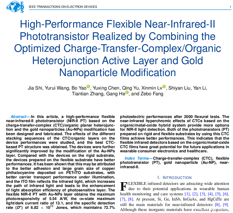 上述研究以“High-Performance Flexible Near-Infrared-II Phototransistor Realized by Combining the Optimized Charge-Transfer-Complex/Organic Heterojunction Active Layer and Gold Nanoparticle Modification”为题于2024年4月9日在线发表于IEEE(国际电气与电子工程协会)期刊IEEE Transactions on Electron Devices(IEEE出版社旗下微电子领域的国际顶级期刊,在国际微电子领域享誉盛名)。这项工作在我校微机电系统浙江省工程研究中心(MEMS工程研究中心)完成,论文第一作者为我校数理信息学院集成电路器件物理与工程专业2021级研究生石佳,我校姚博副教授和方泽波教授为该文通讯作者。芯联集成电路制造股份有限公司为本课题提供资金与技术支持。本研究得到绍兴市产业关键技术攻关计划“揭榜挂帅”重点榜单(2023B41006)和浙江省基础公益研究计划项目(LGG21F050001)等资助。